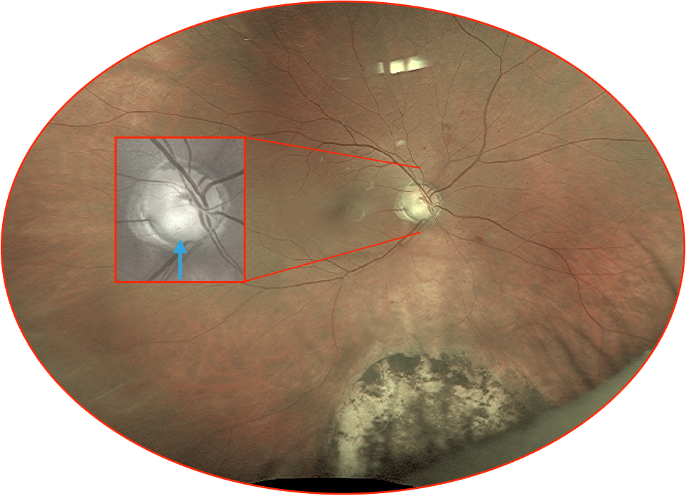 Example 2: There is an inferior coloboma and an accompanying coloboma of the optic nerve head (the color has been optimized for visualization and enlarged in the inset, blue arrow). This patient had an additional coloboma of the inferior iris (not shown).