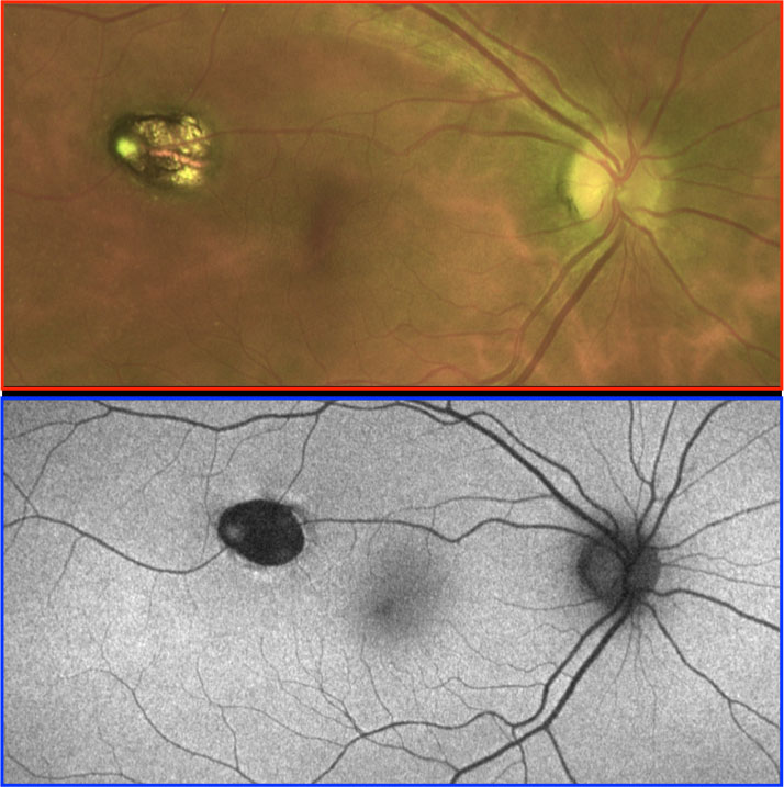 Example 3, Part 1: A coloboma with corresponding autofluorescent imaging. While this is not in a classic location, the next image of the accompanying OCT of the overlying region is demonstratively useful.
