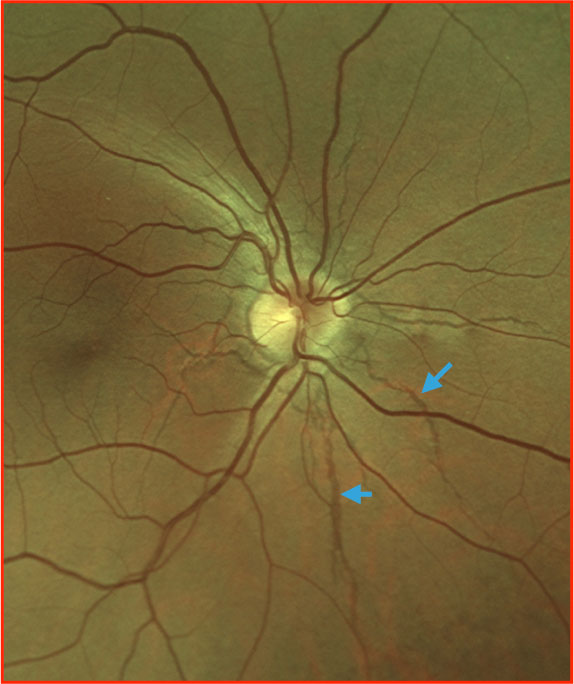 Angioid streaks (blue arrows) can be noted as reddish-brown lines emanating from the optic nerve head. They represent breaks in Bruch’s membrane and are commonly associated with systemic diseases (pseudoxanthoma elasticum among others). On autofluorescence these streaks can be noted as hypoautofluourescent areas. Furthermore, autofluorescence imaging often aids with visualization in more subtle cases.